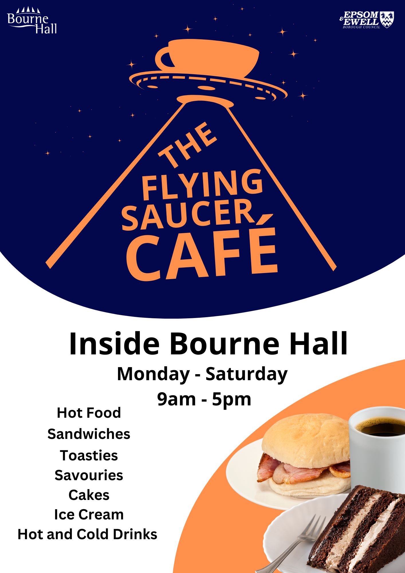 The Flying Saucer Café is based inside Bourne Hall’s futuristic, spaceship-like building and is a popular social spot within our community hub. Open Monday to Saturday from 9am to 5pm, the café serves a great range of hot and cold drinks, homemade cakes and savouries like sandwiches and pastries, plus plenty of snacks. It’s a welcoming space for visitors to relax, catch up, or grab a quick bite while enjoying everything Bourne Hall has to offer.